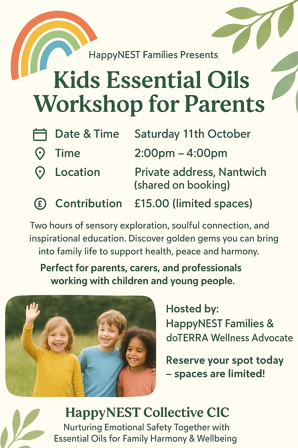 At HappyNEST, I bring these tools into programmes for children, young people, parents, and educators. Using colour, energy, and essential oils, we support children to feel seen, heard, and appreciated, helping them focus, collaborate, and feel relaxed. Families and schools also benefit, as these tools foster positive relationships, inner balance,